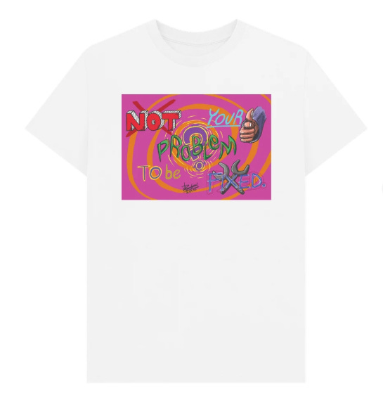 The T-Shirts below were lovingly designed by neurodivergent and disabled artist Vijay Panchal, and I am really excited to share them with you. Though pictured in white, each t-shirt has three colour alternatives to select from. Click the images to view them on the website.